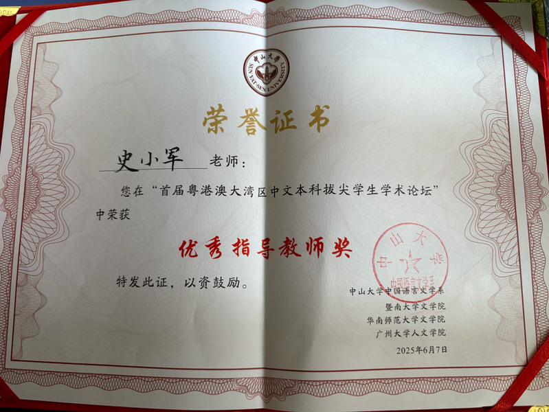 在近日举办的首届粤港澳大湾区中文本科拔尖学生学术论坛中,史老师指导的汤俊怡、吴睿涵同学分别汇报了自己的学年论文《论<红楼梦>的婚丧叙事》与《论<金瓶梅>的“结亲”现象及其文化内涵》,其中前者获得论坛二等奖。史小军老师也因此成为暨南大学唯一一位指导两名学生入选论坛的教师,并荣膺“优秀指导教师奖”。